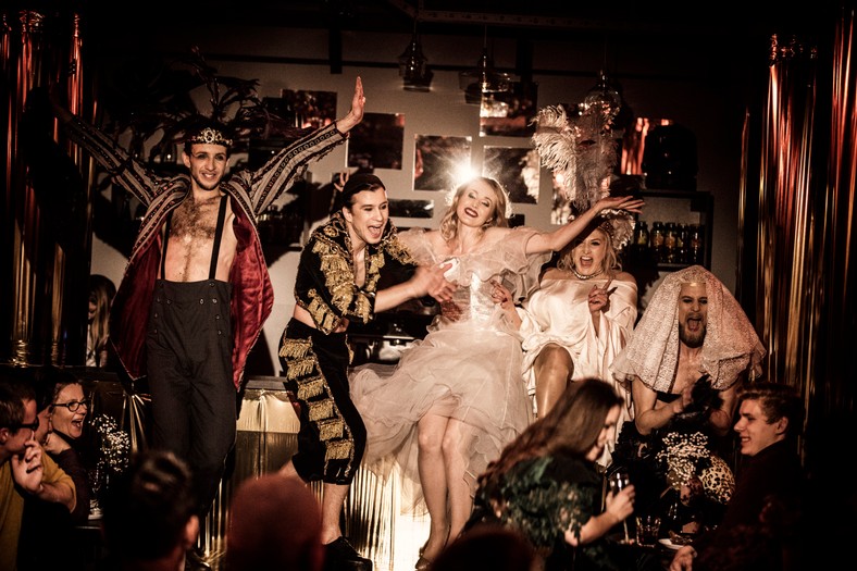 alternatywnie, wyjątkowo, podziemnie i tylko dla dorosłych.Przesadzam? To już spieszę z wyjaśnieniami. Podziemnie, bo spektakl "Nogi Syreny" grany jest w niewielkiej przestrzeni kawiarni teatru, która położona jest właśnie w podziemiach. Dla dorosłych... cóż, zarówno humor, treść, jak i pewne elementy spektaklu u młodszych może i by rozpalały wyobraźnię, tylko nie wiem czy byłyby do końca czytelne. Alternatywnie - cóż styl "Pożaru w burdelu" nie wszyscy lubią, a jeżeli miałbym do czego porównywać "Nogi" to właśnie do kultowych już w stolicy przedstawień. Piosenka, teatr, kabaret, show, groteska, dowcip, czyli wielki miszmasz, specyficzny i pewnie nie dla wszystkich. Może kogoś oburzy, zniesmaczy, ale wielu sprawi też ogromną frajdę, trzeba tylko poddać się tej specyficznej atmosferze. Jest wyjątkowo, bo też chyba mało kto wpadł na ten pomysł, by widz mógł poczuć się jak w danych kawiarniach w trakcie występów kabaretowych, nie siedział sztywno jak kołek, ale by mógł zjeść, wypić i w coraz luźniejszej atmosferze po prostu się bawić, a nie tylko obserwować.